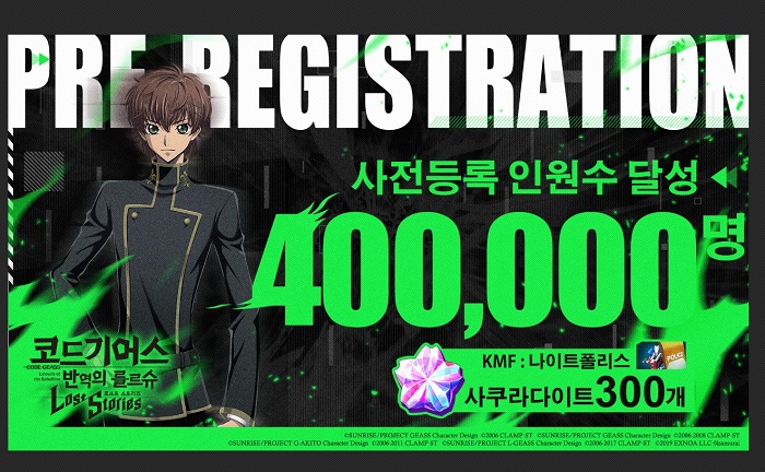 ... ‘코드기어스 반역의 를르슈 로스트 스토리즈’의 출시 소식에 사전예약자가 단기간 40만명을 돌파하며 기대감이 쏠린 이유로는 이전 일본 출시에서 구글 매출 순위 5위, 앱스토어 매출 순위 6위를 기록했을 만큼 검증된 게임이라는 점과 더불어 오랜 시간 한글화