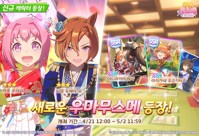 ... 이와 함께, 서포트카드 3종 ‘SSR [옷깃 스치면 복이 온다♪] 마치카네 후쿠키타루’, ‘SSR [밤에는 새벽, 하늘엔 서성] 어드마이어 베가’, ‘R [트레센 학원] 어드마이어 베가’를 업데이트했다.