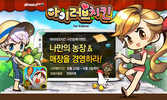 ... 아프리카TV는 아이러브치킨 출시에 앞서 내달 2일까지 이벤트 페이지에 자신의 핸드폰 번호를 등록해 사전 다운로드를 예약하거나, 아프리카TV 모바일게임 공식 페이스북을 방문해 '좋아요'를 클릭한 이용자에게 LG 휴대용 프린터 '포켓 포토', 베스킨라빈스 아이스크림 상품권, 게임머