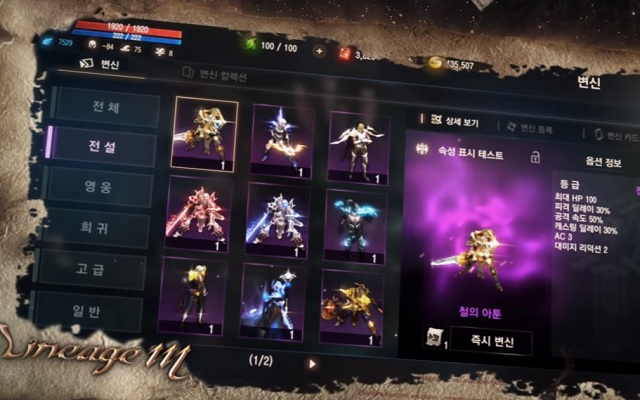 ... 각 변신은 고유의 능력치를 보유하고 있으며 상위 등급일수록 그 능력치는 상승한다. BJ 난닝구가 얻은 전설 등급 변신, 드래곤 슬레이어는 이동 속도 +5%, 공격 속도 +148%, 시전 속도 +20%, 대미지 리덕션 +2, 근거리 및 원거리 대미지 +3을 보유했으며 영웅 등급