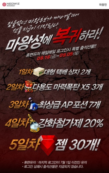 ... ‘마왕전’을 지속적으로 플레이 하고 있는 일반 유저를 위한 이벤트도 진행된다. 해당 기간 동안 랜덤하게 다양한 깜짝 아이템 선물을 제공할 예정이다. '마왕전'은 마계의 마왕 후보들이 강력한 마왕으로 성장해가는 과정을 그린 게임으로, 캐릭터를 육성시키는 RPG에 다양한 소