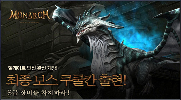 ... 특히 최고 난이도 던전인 10층에서는 헬게이트에서 가장 강력한 힘을 가진 최종 보스몬스터 '쿠쿨칸'이 등장한다. 이용자는 쿠쿨칸 처치시 최고 등급인 S급 무기 및 방어구를 획득할 수 있다. 이밖에도 장비의 최고 강화 단계가 기존 10단계에서 15단계까지 확장되고 부족한 방