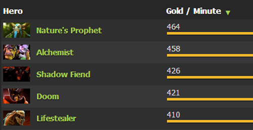 ... 해외 각종 도타 정보를 서비스하고 있는 ‘도타버프(dotabuff. com)’에 따르면 영웅들은 게임 내에서 분당 200~400정도의 골드를 수급하고 있다. 이 중 자연의예언자, 연금술사, 그림자마귀, 파멸의사도, 흡혈마는 1분에 400이 넘는 골드를 획득하며 캐리(팀을 승