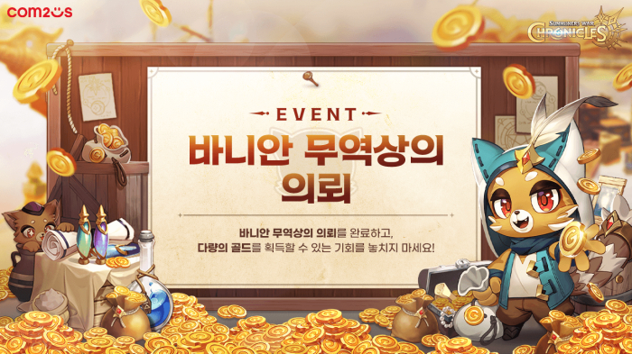 ... 오는 21일까지 바니안에게 필요한 물건을 사냥이나 채집 등을 통해 구해서 제공하면, 다량의 골드를 한 번에 획득할 수 있다. 태생 5성 물 속성 발키리의 특별 소환 이벤트도 열린다. 물 속성 발키리는 기사형 소환수로, 적에게 공격력 감소를 부여하는 ‘물의 전개