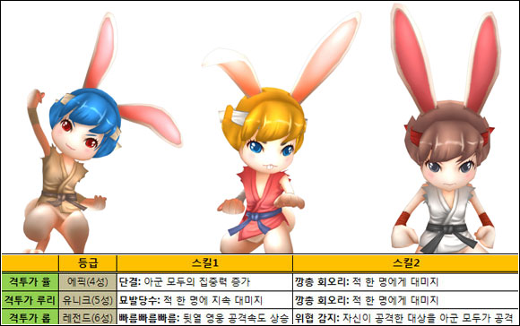 ... 8일 게임조선 취재에 따르면 핀콘(대표 유충길)는 자사가 개발하고 서비스하는 모바일게임 '헬로히어로'에 토끼 형상의 신규 캐릭터 3종을 추가하고 이를 기념해 이벤트를 진행할 예정이다. 이번에 추가되는 캐릭터는 총 3종으로 에픽(4성) 등급 '격투가 율', 유니크(5성) '