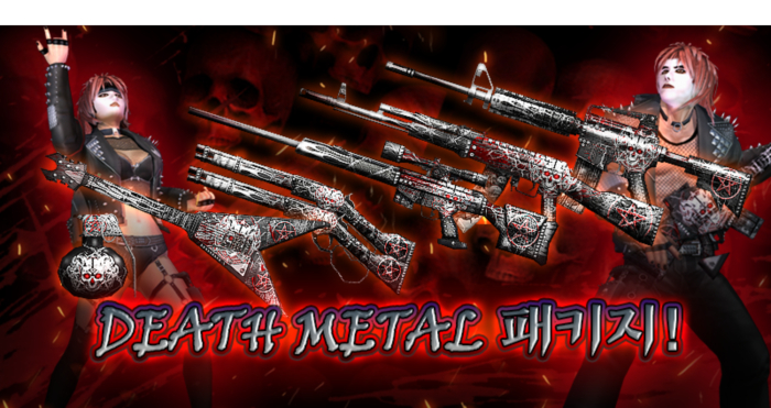 ... DEATH METAL 무기 시리즈는 죽음을 노래하는 데스메탈 밴드를 콘셉트로 한 총기 7종, 기타 1종, 수류탄 1종으로 총 9종이다. 장비 시리즈는 데스메탈 밴드의 외향적 모습을 장식할 수 있는 가발, 의상, 권총집, 가방 등으로 구성됐다. 데스메탈 무기 3종(M4A1