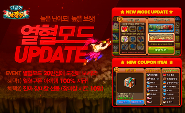 ...또한 해당 모드에서 고득점을 기록하면 기존 상점 아이템은 물론 ‘하트 추가’와 ‘콤보 끊김 방지’, ‘릴레이 하트 복구’ 등의 신규 아이템까지 랜덤하게 획득할 수 있는 ‘열혈쿠폰’ 아이템이 자동으로 지급된다. 조이시티는 이를 기념해 오는 21일까지 ‘열혈모드’로 20만점 이상을 기