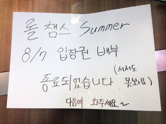 ... 우승이 점쳐지고 있는 CJ엔투스 블레이즈와 KT 불리츠가 맞대결을 앞두고 있는 것. 온게임넷은 이번 경기를 위해 440장의 입장권을 준비했으나 보다 많은 사람들이 현장을 방문해 배부 종료를 알렸다. 온게임넷은 경기장에 들어서는 문에는 “롤챔스 서머 8월 7일 입장권 배부가