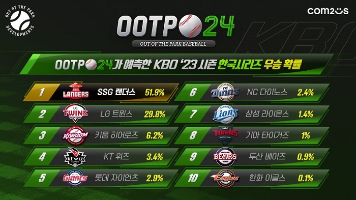... 1천 회에 걸친 정교한 시뮬레이션 결과, 올 시즌 KBO 리그 우승팀에는 ‘SSG랜더스’가 약 51%의 확률로 1위를 차지했다. 창단 3년 차를 맞이한 ‘SSG랜더스’는 지난해 ‘와이어 투 와이어’ 우승을 차
