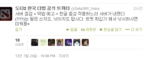... 이는 곧 도타2 게임 내 한국 성우들이 녹음한 더빙 파일이 더해질 것을 예고하는 것으로 받아들여지고 있다. 이와 맞물려 24일 임시점검과 25일 정기점검이 이어져 팬들을 더욱 두근거리게 만들었다. 점검 시간 동안 한국어 더빙이 패치된 것은 아니었으나 팬들은 잦은 점검을 변화