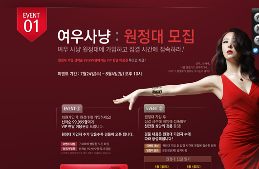 ... 우선 내달 4일까지 회원가입을 마친 ‘여우 원정대’ 중 선착순 9만 9999명에게 VIP 한달 이용권을 전원 지급하며 ‘여우 원정대’에 가입한 유저가 8월 3일과 4일 오후 8시~10시 사이에 접속하면 추첨을 통해 백화점상품권 및 주유상품권, 문화상품권 등 총 1천만원 상당의