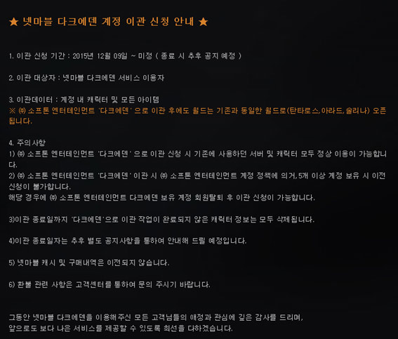 ... 향후 소프톤엔터테인먼트는 다크에덴을 독자 서비스할 방침이다. 이미 계정 이관 및 겨울 이벤트 등 넷마블 이용자를 맞이하기 위한 준비 작업에 착수했다. 이 회사는 오는 9일부터 넷마블에서 다크에덴을 즐겼던 이용자들을 대상으로 계정 이관 신청을 진행한다