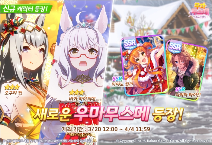 ... 여기에, 서포트 카드 2종 ‘SSR [포메이션: PARTY] 마야노 탑건’과 ‘SSR [고집불통 마르크트] 나리타 타이신’도 업데이트했다. 카카오게임즈는 3월 20일부터 4월 4일까지 이벤트 ‘성스러운 밤에 더해지