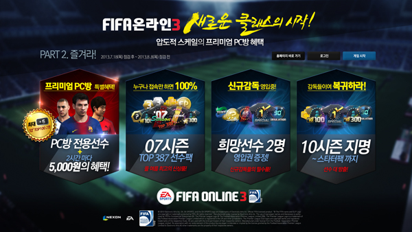 ... PC방 전용선수는 10레벨과 강화단계 3~6, 컨디션 최상 등 높은 수준의 능력치가 설정돼있는 것이 특징이다. 또한 게임 내 구단 운영에 필요한 ‘이적 수수료’ 및 ‘선수 재계약 비용’을 40% 인하하고,선수와 감독 경험치를60% 추가 지급한다. 피파온라인3의 서비스를