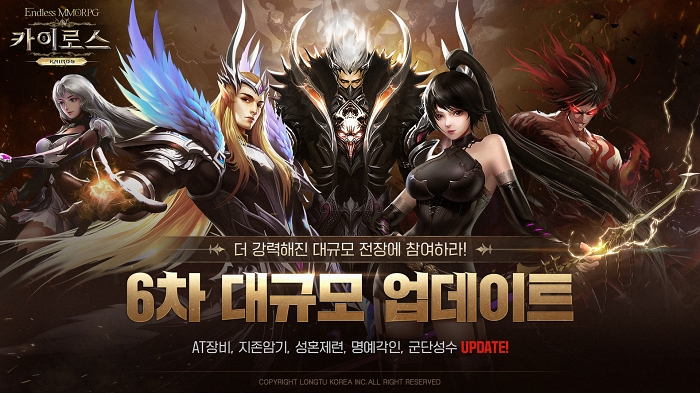 ... 특히, 6차 대규모 업데이트의 메인 컨텐츠 격인 ‘AT(영역)장비 및 단련 던전’은 AT(영역)장비와 관문 돌파 형식의 AT던전이 추가되어 캐릭터의 장비를 성장시키고 전투력을 강화시킬 수 있다. ‘카이로스: 어둠을 밝히는 자&rsquo