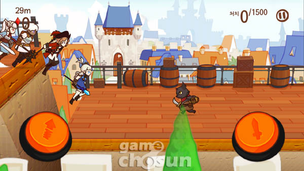 ... 조작방식은 드래그(끌기) 또는 버튼의 2가지 방식을 제공해 이용자들은 본인의 취향에 맞는 방법으로 게임을 즐길 수 있다. 캐릭터가 좌, 우로 이동하며 도망치는 악당을 맞힐 때마다 질주 피버 게이지가 충전되며, 게이지가 100% 충전되면 악당, 황소, 장애물을 모두 제치며 달리