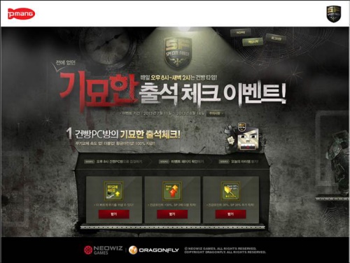 ... 히든 총기는 25일 출석을 모두 완료하면 확인할 수 있다. 아울러 매일 오후 8시부터 새벽 2시 사이에 ‘건빵PC방’에서 게임을 즐긴 이용자에게는 ‘무기교체속도업’, ‘경험치더블업’, ‘황금야전삽’ 중 이용자가 원하는 아이템을 선택해 지급 받을 수 있다. 이 외에도 ‘