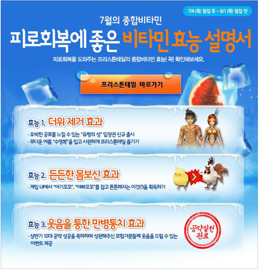 ... 또 오싹함으로 더위를 이길 수 있을 뿐 아니라 대박 아이템도 얻을 수 있는 ‘유령의 성’ 인던 입장권과 보기만 해도 시원한 수영복 커스튬도 업데이트됐다. 또 2013년 프리스톤테일의 10대 공약 중 5가지가 실천 완료된 기념으로 7월 18일부터 2주간에 걸쳐 ‘웃음을 통해