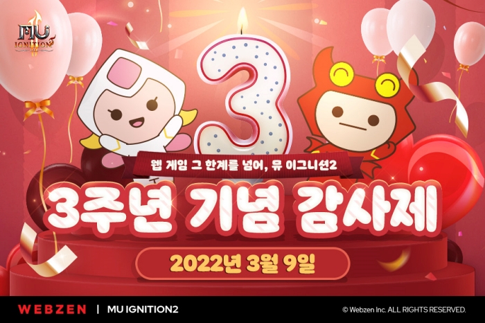 ... 먼저 모든 '뮤 이그니션2' 회원들에게 '감사 선물'을 증정한다. 뮤 이그니션2 공식 사이트에서 3주년 감사제의 '3주년 선물 받기'를 클릭하고 서버와 캐릭터명을 입력하면 빠른 캐릭터 육성에 도움되는 '귀속 다이아'