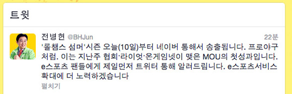 ... 앞으로도 한국e스포츠협회는 팬들을 위한 e스포츠 서비스 확대에 지속적으로 노력해 갈 것입니다”라고 밝혔다. 한편 한국e스포츠협회는 지난 3일 라이엇게임즈, 온게임넷과 리그오브레전드 e스포츠 발전을 위한 협약식’을 체결한 바 있다. [오경택 기자 ogt8211@chosun