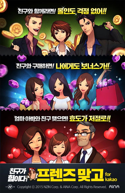 ... 엔진은 '프렌즈 맞고' 출시를 기념해 ‘친구’를 컨셉트로 한 3종의 풍성한 이벤트를 준비했다. 게임을 다운로드 받아 3레벨만 달성 하면 한정판 ‘카카오 프렌즈’ 이모티콘이 즉시 지급되며 30명 이상의 친구를 초대하면 추첨을 통해 쥬얼리 혹은 유명 시계와 카카오프렌즈 얼굴 쿠션