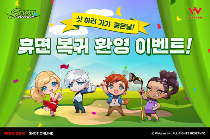 ... 먼저, 휴면 계정은 샷온라인 게임에 접속만 해도 '복귀 유저 전용 상품 티켓', '암브로시아 55% 5홀', '스마트 볼마커 A 7일 교환권' 등의 고급 아이템을 선물한다. 이어서 복귀한 이용자는 '일일 홀카운트 미션
