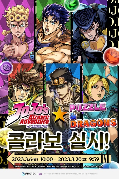 ... 죠죠의 기묘한 모험과의 콜라보레이션을 기념해 이벤트 기간 동안 최초 1회 로그인에 한해 ‘개최기념! 죠죠의 기묘한 모험 에그’를 획득 가능하다. 콜라보 캐릭터 ‘쿠죠 죠린’을 최초 획득 시 ‘죠죠의 기묘한 모험 드롭&r