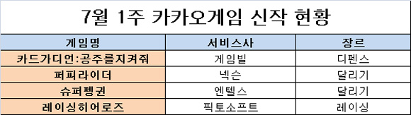 ... 이 중 2주차에 출시된 ‘모두의마블’과 4주차에 출시된 ‘다같이칼칼칼’이 눈부신 성적을 거두고 있는 가운데 신작 4종이 도전장을 내밀었다. 지난 주 소셜네트워크게임(SNG) 장르인 ‘캣타운’을 출시한 바 있는 게임빌이 디펜스 장르인 ‘카드가디언:공주를지켜줘’를 출시했다. 넥