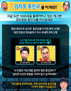 ... 텐센트코리아가 국내 시장에 첫 선을 보인 모바일게임 '도전1000곡 for kakao'에서 신곡 업데이트와 함께 이벤트가 지난 29일부터 시작됐다. 이번 업데이트를 통해씨스타와 애프터스쿨, 시크릿, 틴탄, BAP 등의 신곡이 추가됐고 유명 개그맨 김지호와 홍인규가 무작위 대전