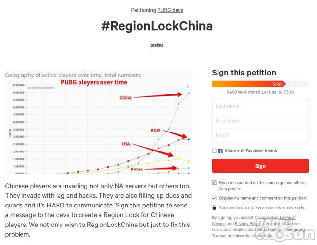...org에 올라온 이번 서명 운동은 16일 오전 5489명의 동의를 받으며 다음 목표인 7500명을 향한 캠페인을 지속하고 있다. 지역락(Region Lock)이란 현재 ‘배틀그라운드’가 글로벌 서비스 되고 있는 스팀에서 중국 서버를 분리, 중국에서 접속한 이용자들이 타 지역 서버를