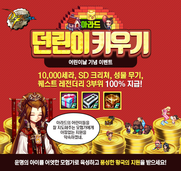 ... PC방에서 접속 시, 누적 출석 횟수 10회를 달성하면 ‘TRG21 Gold 영구제’ 아이템을 추가로 제공한다. ‘던전앤파이터’에서는 25일까지 어린이날을 기념해 ‘아라드 던린이 키우기’ 이벤트를 진행한다. 게임 내 ‘황녀 에르제’ NPC(Non-Player Character)