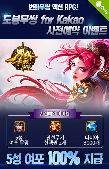 ...사전예약은 카카오 게임 페이지 내 사전예약 메뉴를 통해서 가능하고, 쿠폰일퀘 등 사전예약 앱을 통해서도 참여 가능하다. 퍼펙트월드코리아는 "'도봉무쌍 for Kakao'는 무기에 따라 승부가 달라지는 특성에 맞춰, 사전예약자 전원에게 전설무기 2종과 5성 장수 여포를 제공함으로서,
