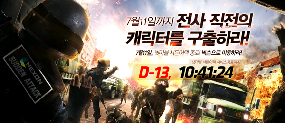 ...그간 넷마블과 넥슨을 통해 공동 서비스를 진행해왔던 서든어택이 오는 7월 11일부로 넷마블의 손을 완전히 벗어나기 때문이다. 서든어택은 향후 넥슨에서 단독 운영된다. 기존 넷마블 이용자는 서비스 종료일까지 넥슨 계정으로 캐릭터를 이전해야 지만 게임을 계속 이용할 수 있다