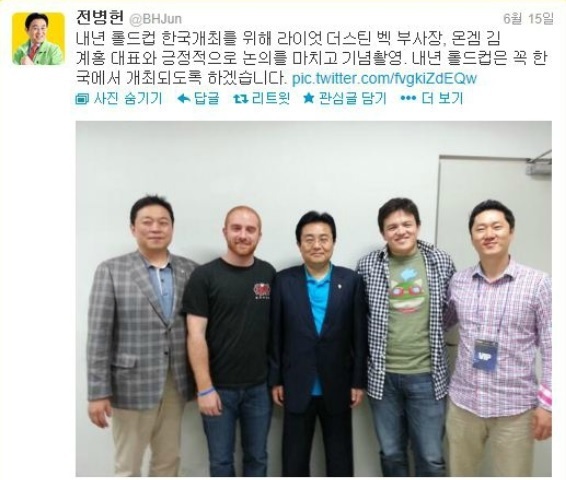 ... 이번에 e스포츠 팬들에게 주목을 받고 있는 이유는 전 회장의 트위터에 한국의 롤드컵 개최 가능성을 언급했기 때문이다. 전 회장의 트위터에는 지난 15일 LOL 더 챔피언스 스프링 결승전 당시 사진이 한 장 걸렸다. 이 사진에는 전 회장을 비롯해 김계홍 온게임넷 대표와 더스틴