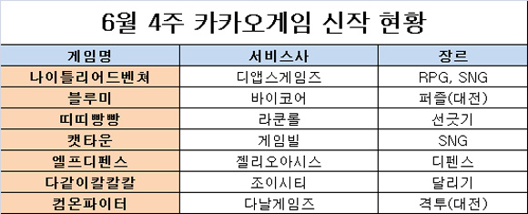 ... ‘사무라이쇼다운’ IP를 활용한 조이시티의 신작 달리기게임 ‘다같이칼칼칼’이 출시됐고 게임빌의 신작 SNG ‘캣타운’도 모습을 드러냈다. 또한 오락실 게임으로 잘 알려진 ‘컴온베이비’ 모바일 버전인 다날게임즈의 신작 ‘컴온파이터’ 역시 론칭됐다. 또한 라쿤롤의 ‘띠띠빵빵’