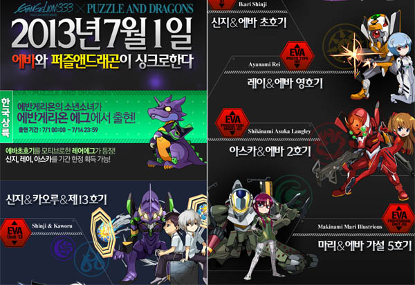 ...이는 일본에서 우선 적용됐던 콘텐츠로 에반게리온의 주요 캐릭터를 퍼즐앤드래곤에 맞게 적용해 게임 내 구현한 것. 이벤트 기간 동안 게임 내에서는 에바초호기를 모티브로 한 레어에그가 등장하고 게임 진행을 통해 신지와 레이, 아스카 등을 획득할 수 있다. 또한 14일까지 퍼즐앤드래곤