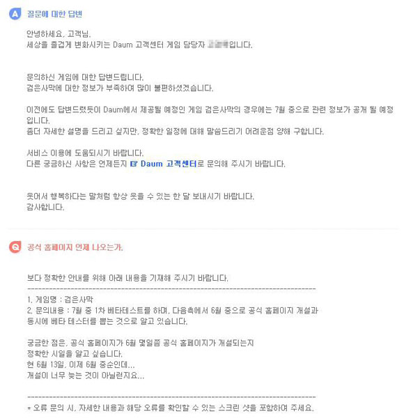 ... '검은사막'의 퍼블리싱을 맡은 다음커뮤니케이션(이하 다음)은 지난 1월 22일 서울 중구 플라자호텔에서 '검은사막' 기자간담회를 열고 7월 중 비공개 테스트를 진행할 예정이라고 밝혔다. 또 펄어비스가 운영하는 '검은사막' 공식 페이스북을 통해서 6월 중 공식 홈페이지를 공개할