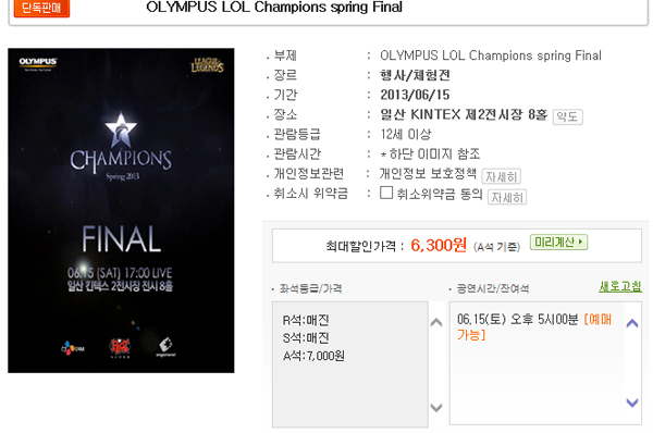 ... 이번 결승전은 무료 좌석이 전혀 없기 때문에 현장 판매분은 없으며 12일 오후 10시에 티켓 판매가 마감되는 순간 좌석 배정도 동시에 끝난다. e스포츠 관계자들은 현재 티켓 판매량과 속도에 관해 많은 관심을 갖고 있다. 이유는 앞서 언급한 것처럼 한국 e스포츠 사상 처음으로