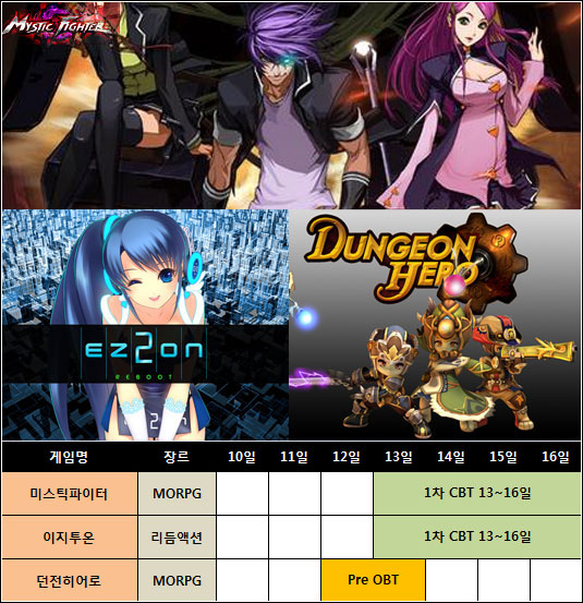 ... E3로 뜨거운 6월 둘째 주에도 신작 온라인게임 3종이 테스트를 진행합니다. '크리티카'와 '던전스트라이커'의 열풍을 잇는 MORPG(다중접속역할수행게임) '미스틱파이터' '던전히어로' 등 2종과 오랜만의 리듬액션게임 '이지투온'이 주인공입니다. ◆ 던파 겨냥한 '미