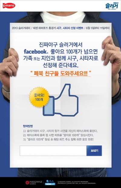 ... 네오위즈게임즈는 자사가 서비스하고 와이즈캣이 개발한 온라인 야구게임 ‘슬러거'가 넥센 히어로즈 홈 경기 시구, 시타자가 될 수 있는 '슬러거데이' 이벤트를 진행한다고 7일 밝혔다. 이번 이벤트는 이용자들에게 오는 23일 목동 야구장에서 열리는 넥센 히어로즈의 홈 경기에서