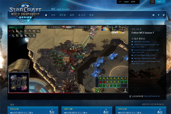 ...starcraft2. com/wcs)에서 오는 7일부터 9일까지 진행 예정인 WCS 시즌1 파이널에 대한 일정, 대진표, 경기 결과 등의 정보를 확인할 수 있다. 또 이용자는 사이트에 최초 접속시 생방송 중인 경기가 있을 경우 실황 중계 영상을 시청할 수 있으며, 그렇지 않을