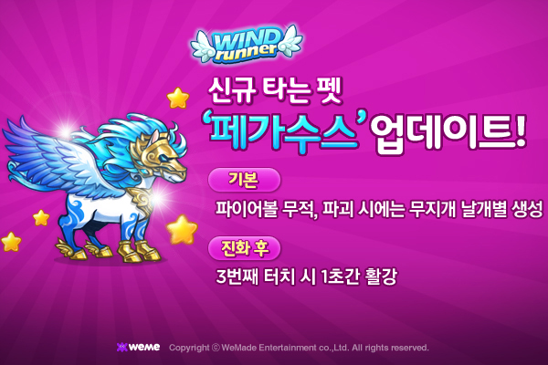 ... 7번째 타는 펫 '페가수스'는게임플레이 중 방해 요소로 등장하는 '파이어 볼'의 피해로부터 메인 캐릭터를 보호하는 능력을 갖추고 있다. 페가수스에 탑승한 채로 파이어 볼에 부딪칠 경우, 몬스터를 사냥했을 때와 같이 점수를 얻고 플레이를 이어갈 수 있다. 특히, '페가수스'의 레