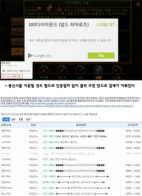 ... 2인조로 구성된 이들 일당은 서울을 포함한 전국 PC방을 돌며 문자를 급히 보내야 한다며 스마트폰을 빌린 후유료 게임 아이템을 결제하고 이를 게임 아이템 거래 사이트에 판매해 현금화한 것으로 드러났다. 또결제 한도액을 넘지 않기 위해 여러번 나눠 결제하는 치밀함을 보인 것으