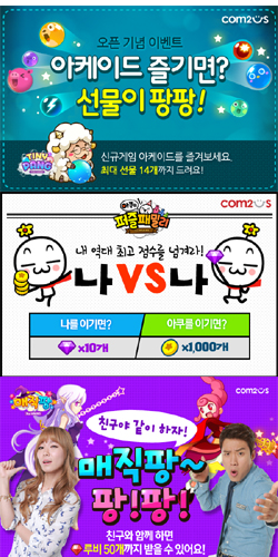 ... 아케이드 모드는 1회 플레이 시 시간제한 없이 게임을 지속할 수 있다. 아쿠의퍼즐패밀리도 이용자 본인의 최고 기록을 갱신하면 캐시아이템 ‘보석’을 제공하는 ‘나vs나’이벤트를 마련했다. 또 ‘아쿠’의 기록 500만점을 넘기면 코인아이템도 추가로 증정한다