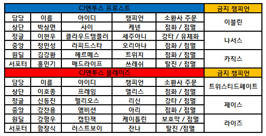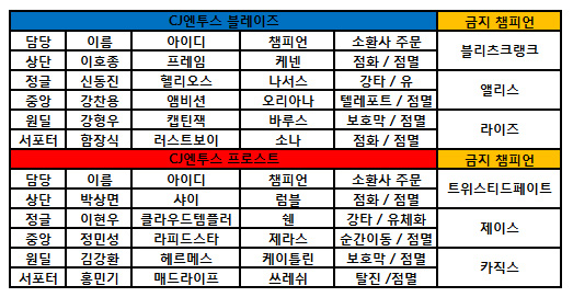 ... 블레이즈는 리신과 아리, 리신, 케이틀린을 가져가며 라인전에서 공격적인 플레이를 할 것을 암시한 반면 프로스트는 세주아니, 케넨, 오리아나를 가져가며 교전 지향형 챔피언을 선택했다. 블레이즈 하단 듀오 ‘캡틴잭’ 강형우와 ‘러스트보이’ 함장식은 상단에서 시작해 ‘샤이’ 박상