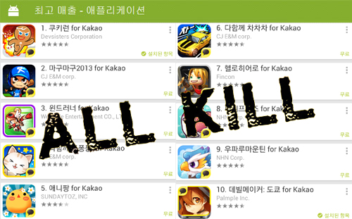 ... 구글 플레이스토어가 30일 공개한 게임부문 최고매출 순위를 살펴보면 1위부터 10위까지 모두 카카오톡 게임이 차지했다. 30위권 내 순위 역시 7종을 제외한 23종의 카카오톡 게임으로 도배됐다. 미들코어 시대를 맞아 카카오 게임 플랫폼이 전개해온 장르 다각화 전략도 성
