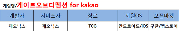 ...0 ★★★ 캐쥬얼 열풍이 불고 있는 모바일게임 시장에 묵직한 콘텐츠로 무장한 신작이 등장했다. 바로 TCG 명가 제오닉스의 '게이트오브디멘션 for Kakao(이하 게이트오브디멘션)'이 그 주인공. 이 게임은 평화로운 세계의 차원의 문이 열리며 몬스터의 침공을 방어한다는