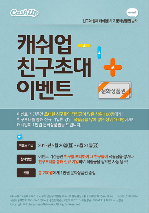 ... 퓨쳐스트림네트웍스(이하 FSN)은 스마트폰 대기화면 광고서비스 '캐쉬업'이 친구초대 이벤트를 실시한다고 28일 밝혔다. 이번 이벤트는 세계 최초의 동영상 대기화면 전면광고인 '캐쉬업'을 알리고자 다음달 21일까지 진행된다. FSN 측은 초대 받은 친구들의 캐