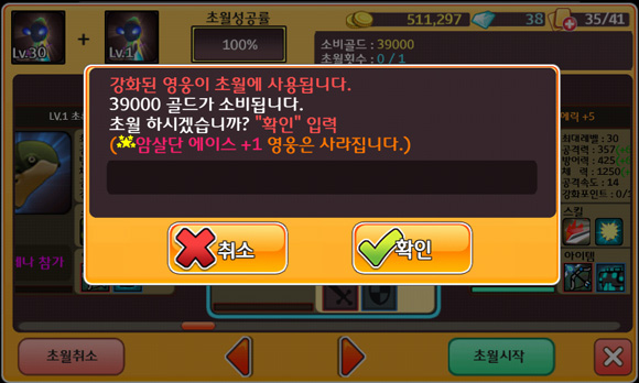 ... 이 가운데 초월 강화는 마스터 등급(3성) 이상의 같은 영웅 둘을 조합해 최고레벨을 30에서 33으로 확장할 수 있는 것으로 강화 조건은 같은 영웅 2명 중 하나의 영웅이 레벨 30이 되야 하고 일반 조합과 달리 강화 수치는 조건에 포함되지 않는다. 초월강화 시 소모되는게임머니
