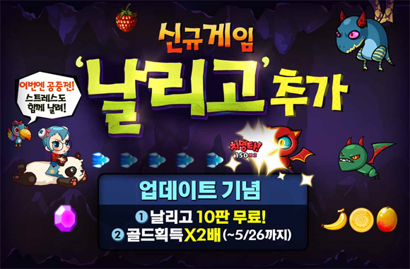 ... 이번에 추가된 날리고는 캐릭터가 새를 타고 날면서 동굴에 서식하는 박쥐를 무찌르는 방식으로 진행된다. 이용자는 화면 터치를 통해 원하는 방향으로 움직일 수 있고 날아오는 박쥐들을 미사일로 공격할 수 있다. 특히 게임 중 나타나는 아이템을 획득하면 일시적으로 스킬이 발동된다